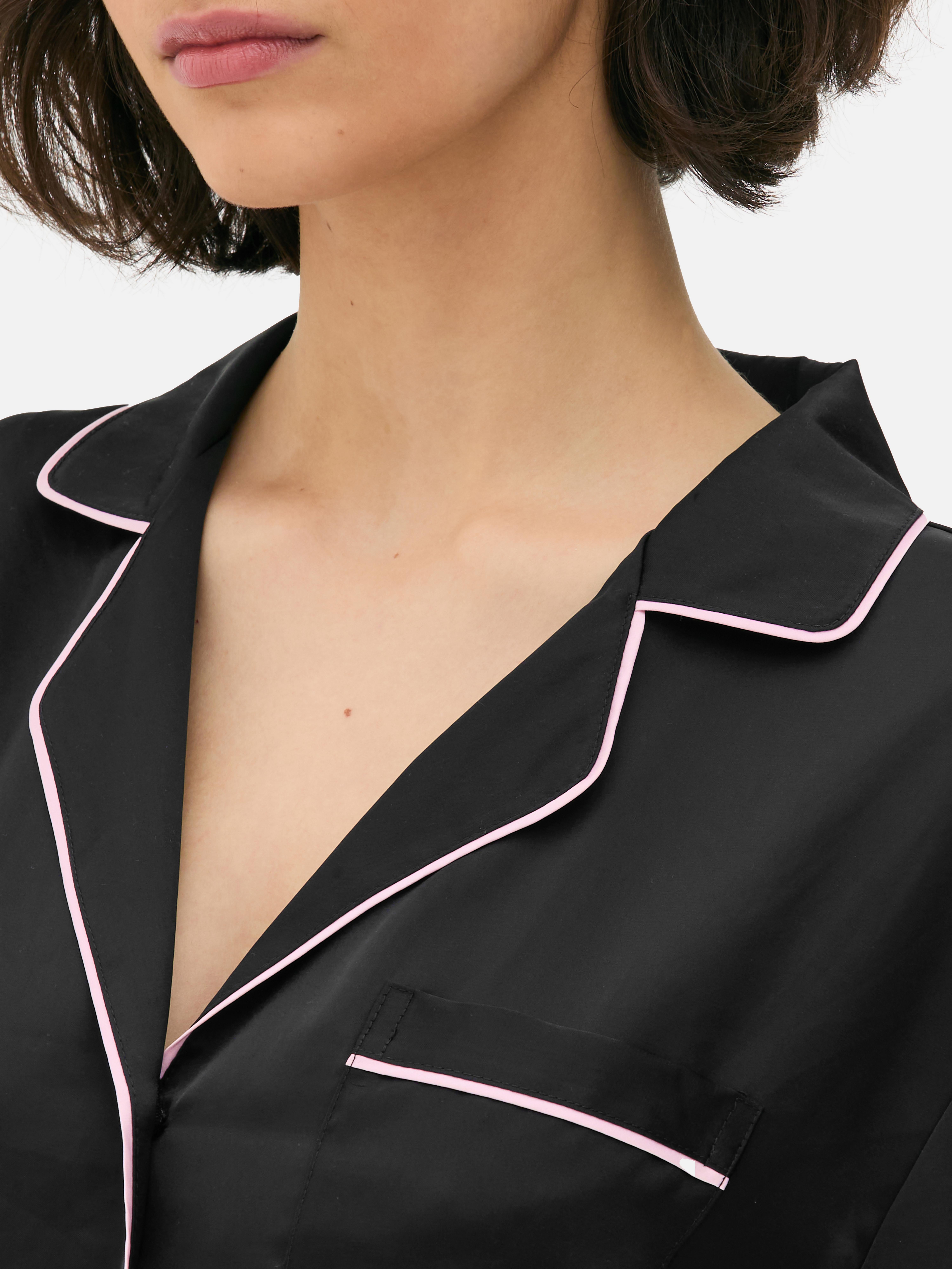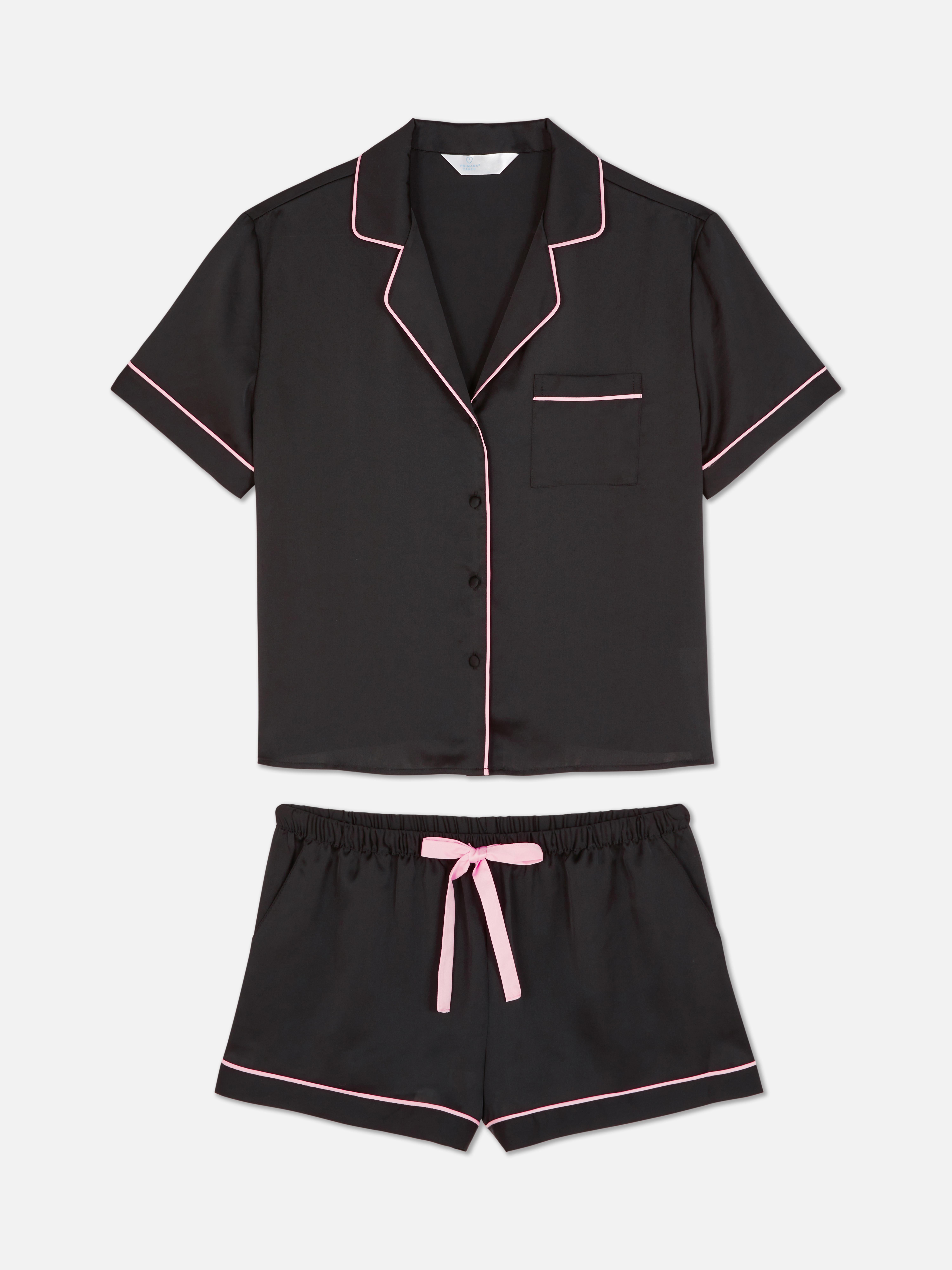 Neckline: Collared Sleeve Length: Short sleeve Leg Length: Short Model Size: S- 10/12 Model Height: 174 cm Print: Solid Color Material: 100% Polyester Fire Safety: WARNING! Keep away from fire Country of Origin: Cambodia Top: Polyester 100% Bottom: Polyester 100% Fabrication: Satin