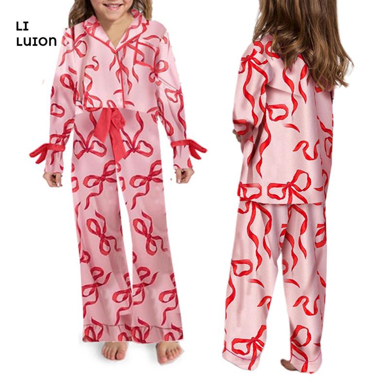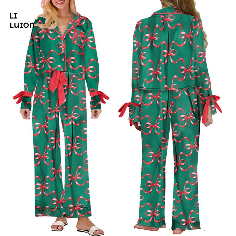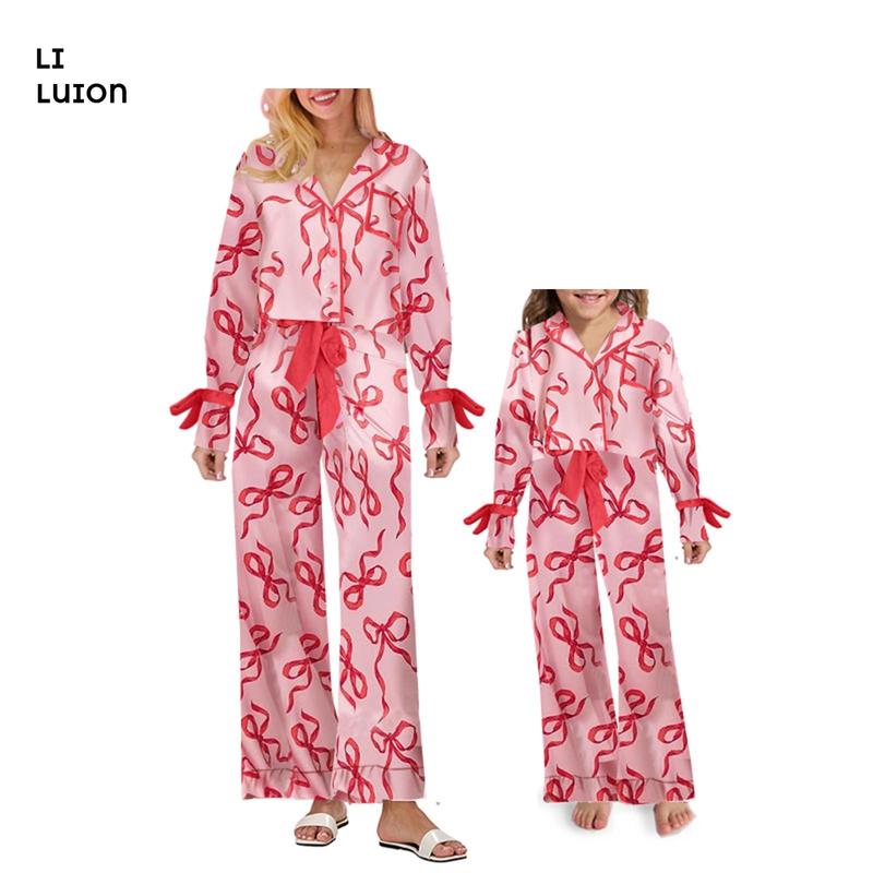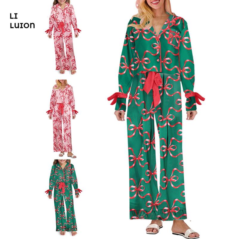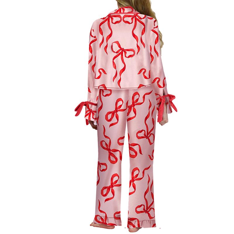 Women Bow Print Lape Pajamas Long Sleeve Button Down Tops and Drawstring Pants Sleepwear long sleeve pink pajamas