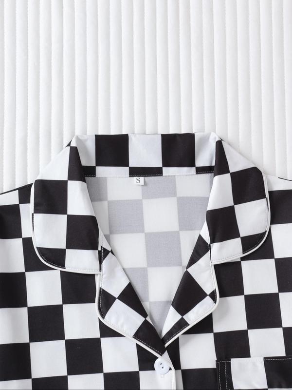 Women's Checkerboard Print Lapel Neck Pajama, Casual Comfy Short Sleeve Button Front Chest Pocket Design Top & Elastic Waist Shorts PJ Set, Ladies Summer Sleepwear