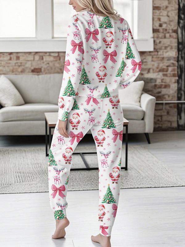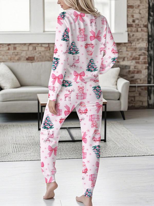 【Festive Pattern】: Showcases a vibrant Christmas print, bringing a cheerful seasonal touch to your loungewear collection.【Long Sleeve Top】: Features a classic long sleeve V-neck design, combining warmth and a chic look for colder seasons.【Adjustable Fit】: Includes tie waist pants for a customizable fit, ensuring comfort while accommodating various body shapes.【All-Season Wear】: Designed for all seasons, providing versatility for year-round use in a relaxing environment.【Home Wear Set】: Complete matching set includes top and pants, offering a coordinated appearance for lounging and sleeping.