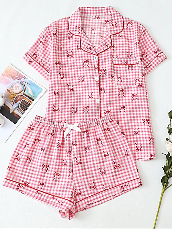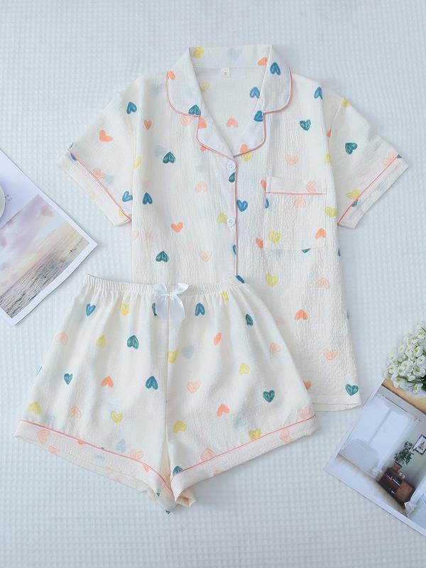 Two Counts Women's Cherry/Heart/Floral Print Lapel Pocket Shirt & Bow Decor Shorts Pyjama Set, Button Front Short Sleeve Top & Contrast Binding Shorts Pj Set, Casual Comfortable Sleepwear Set for Women