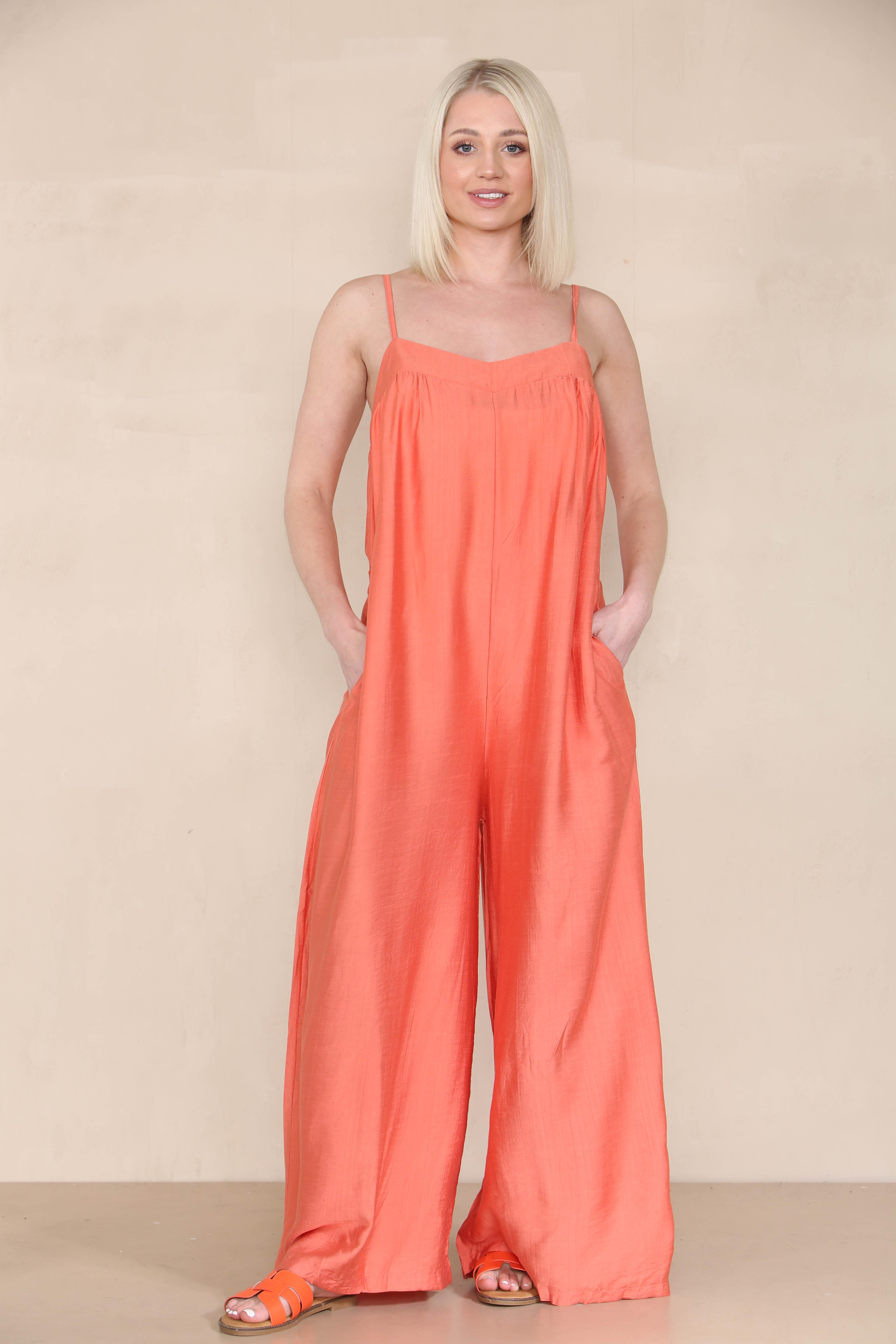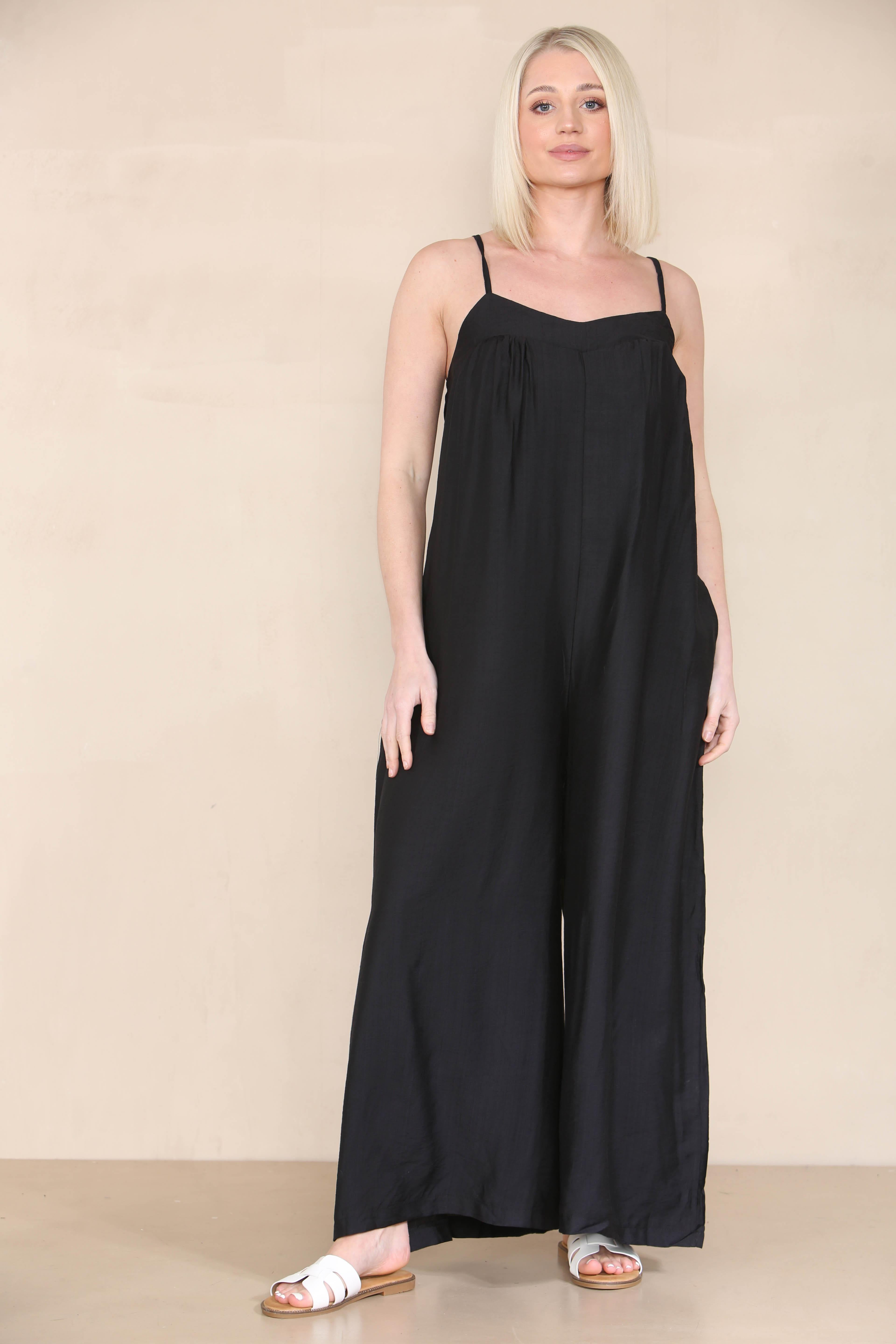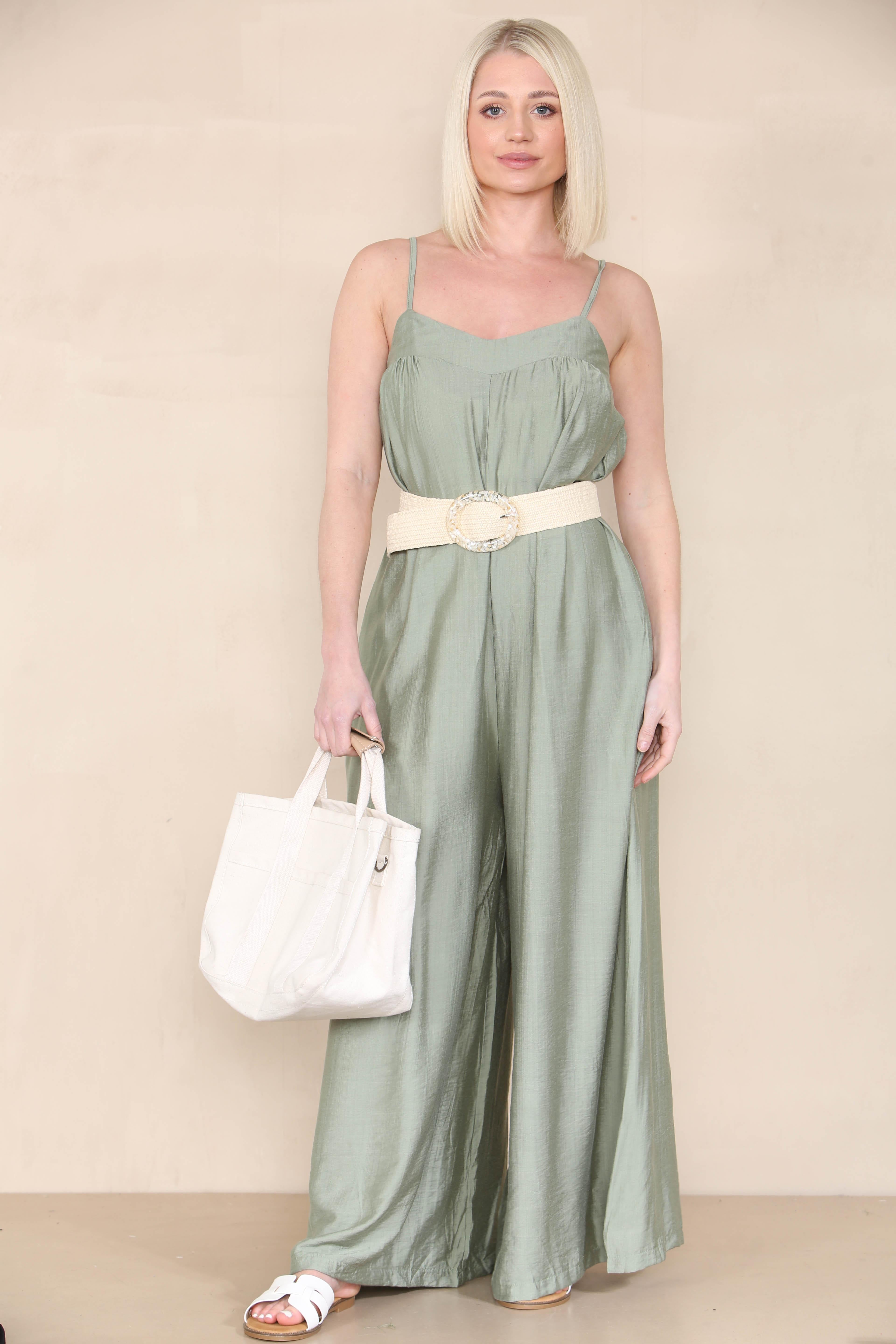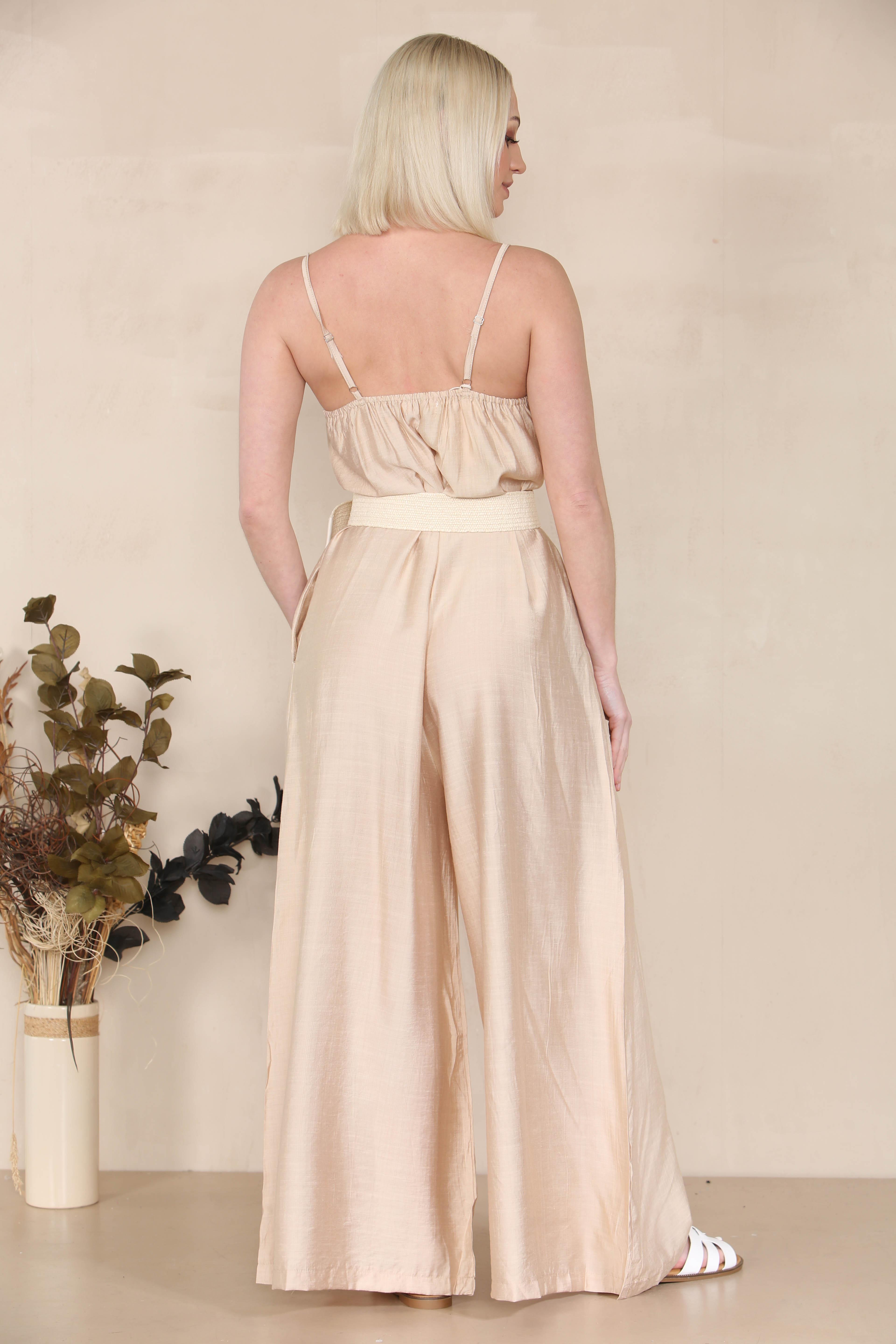 This elegantly designed jumpsuit showcases thin, adjustable spaghetti straps that enhance comfort and fit. For a stylish touch, pair your jumpsuit with soft, wavy hair and a fashionable mini bag.