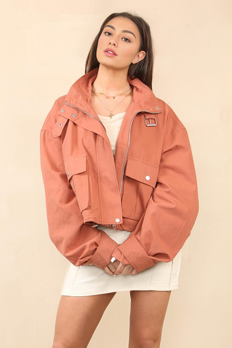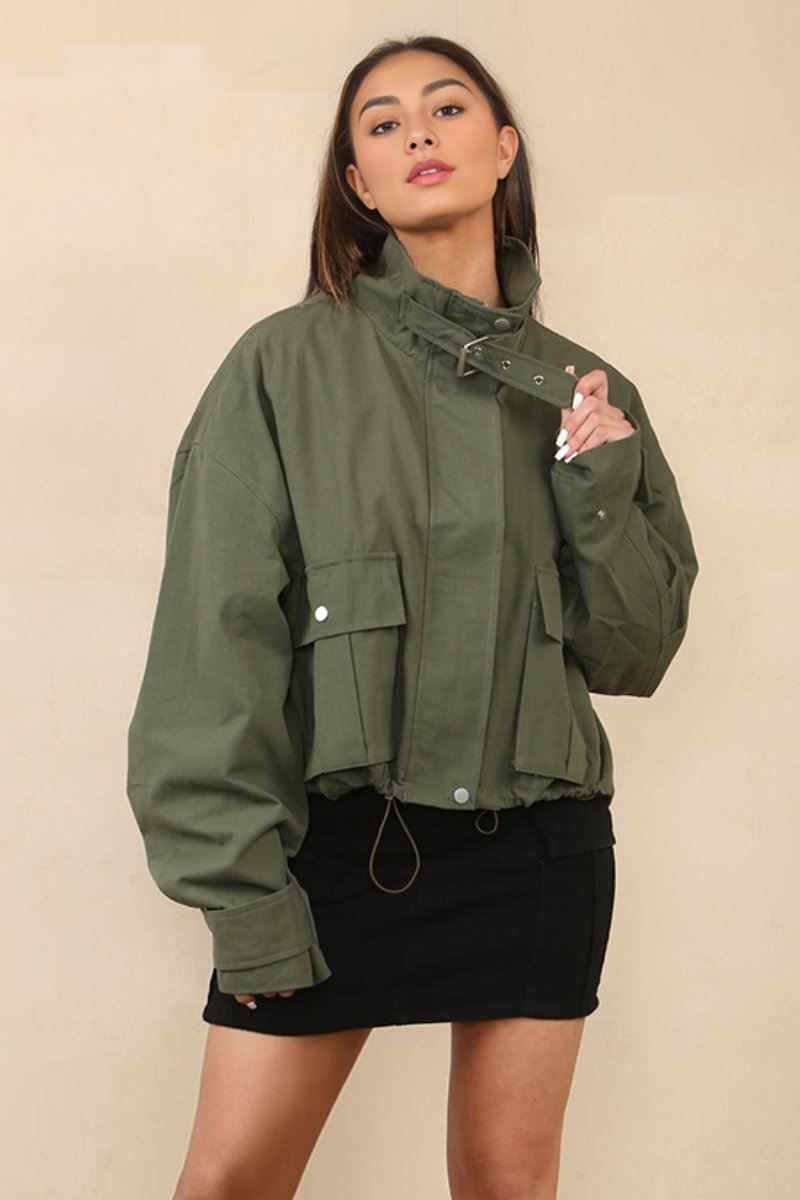 Elevate your wardrobe with this effortlessly stylish piece that’s a must-have!  With its chic stand collar and elegant buckle detail, this jacket combines fashion and function.