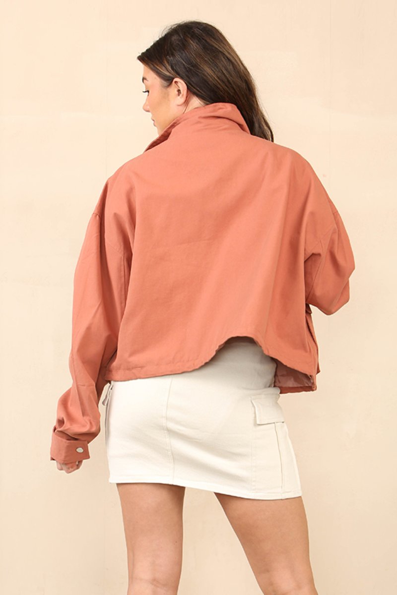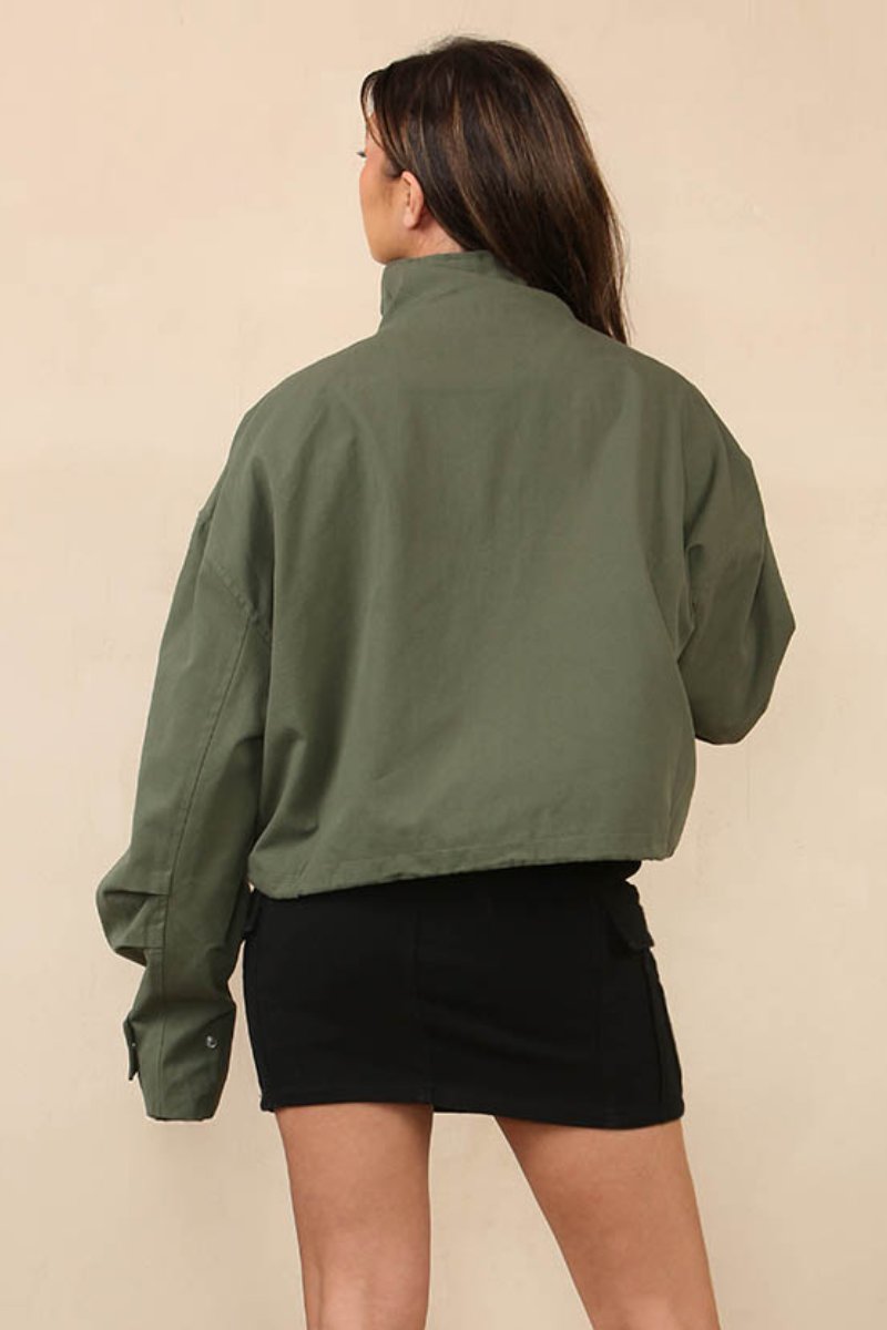 Vintage Stand Collar Flap Pocket Zip-Up Cropped Jacket