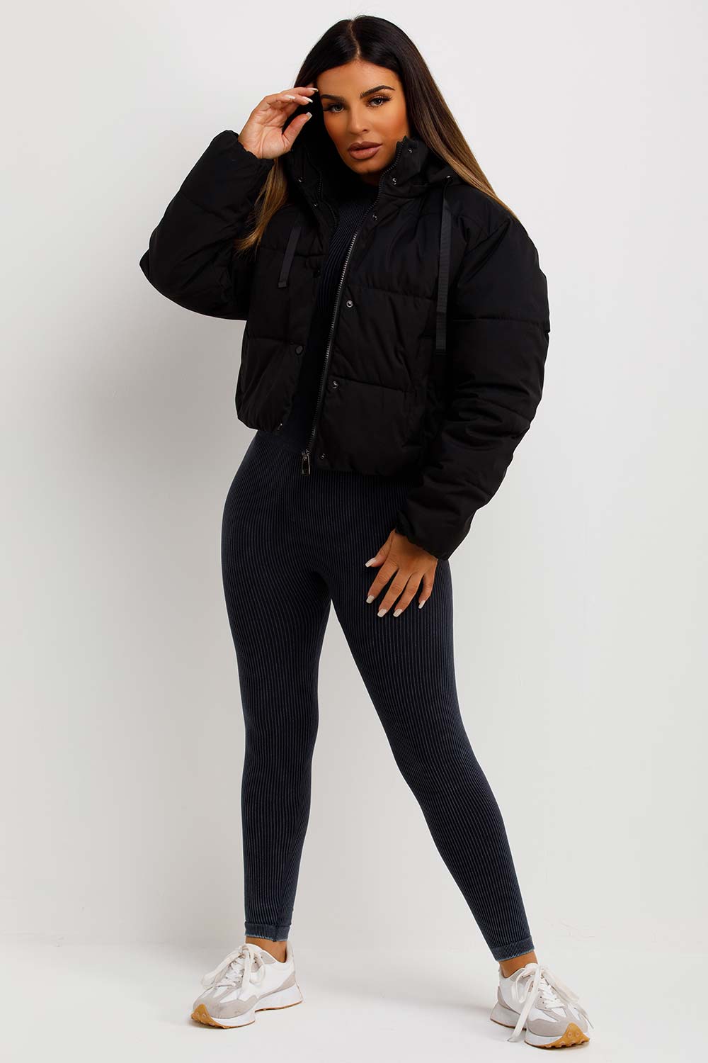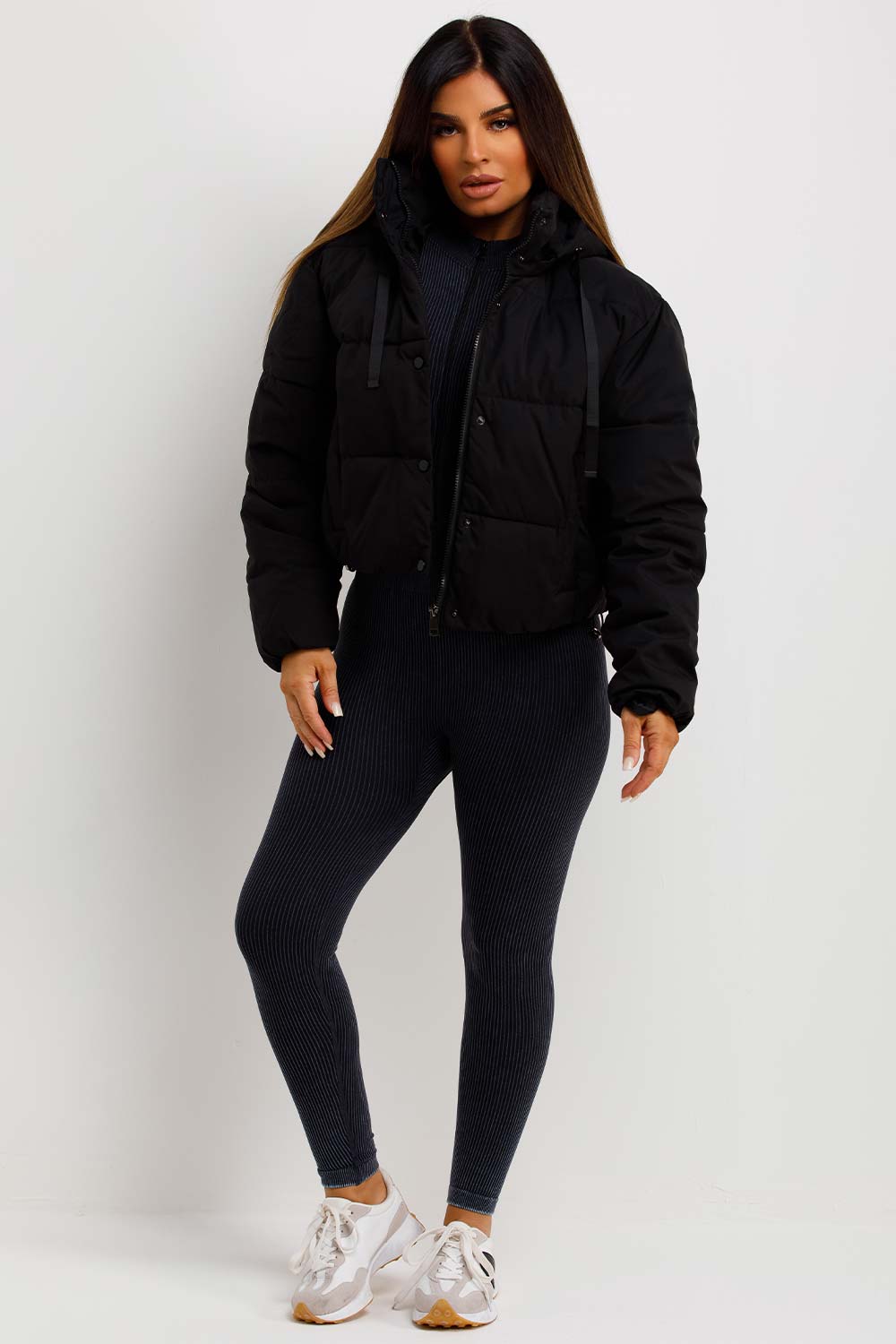 Puffer padded jacket with hood. This puffer jacket is going to solve all your outerwear problems. Featuring thick puffer padded jacket with stud and zip and fastening, hood and drawstring hem. Style this puffer jacket with any outfit to complete the cute cosy look. This puffer jacket is available in black only.