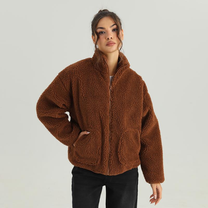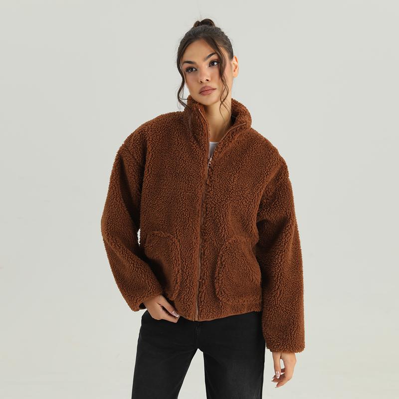Women's Cozy Mock Neck Side Pocket Zipper Fluffy Long Sleeve Outerwear, Versatile Faux Fur Fleece Coat for Fall & Winter, Comfort Solid Color Outfit Jacket