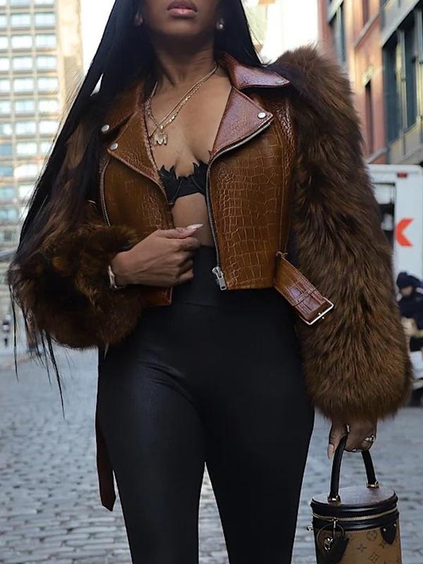 【Unique Material】: Crafted with faux crocodile leather for sleeves, offering a distinct luxurious touch and visual interest.【Zipper Closure】: Features a classic motorcycle zipper, providing practical accessibility and enhancing the jacket's edgy look.【Collar Design】: Incorporates a stylish lapel collar, contributing to a structured finish that complements both casual and upscale outings.【Moderate Thickness】: Made with moderate thickness fabric, suitable for wearing throughout all seasons, offering year-round adaptability.【Tailored Fit】: Designed in a fitted silhouette that highlights the body shape while ensuring ease of movement and wearability.
