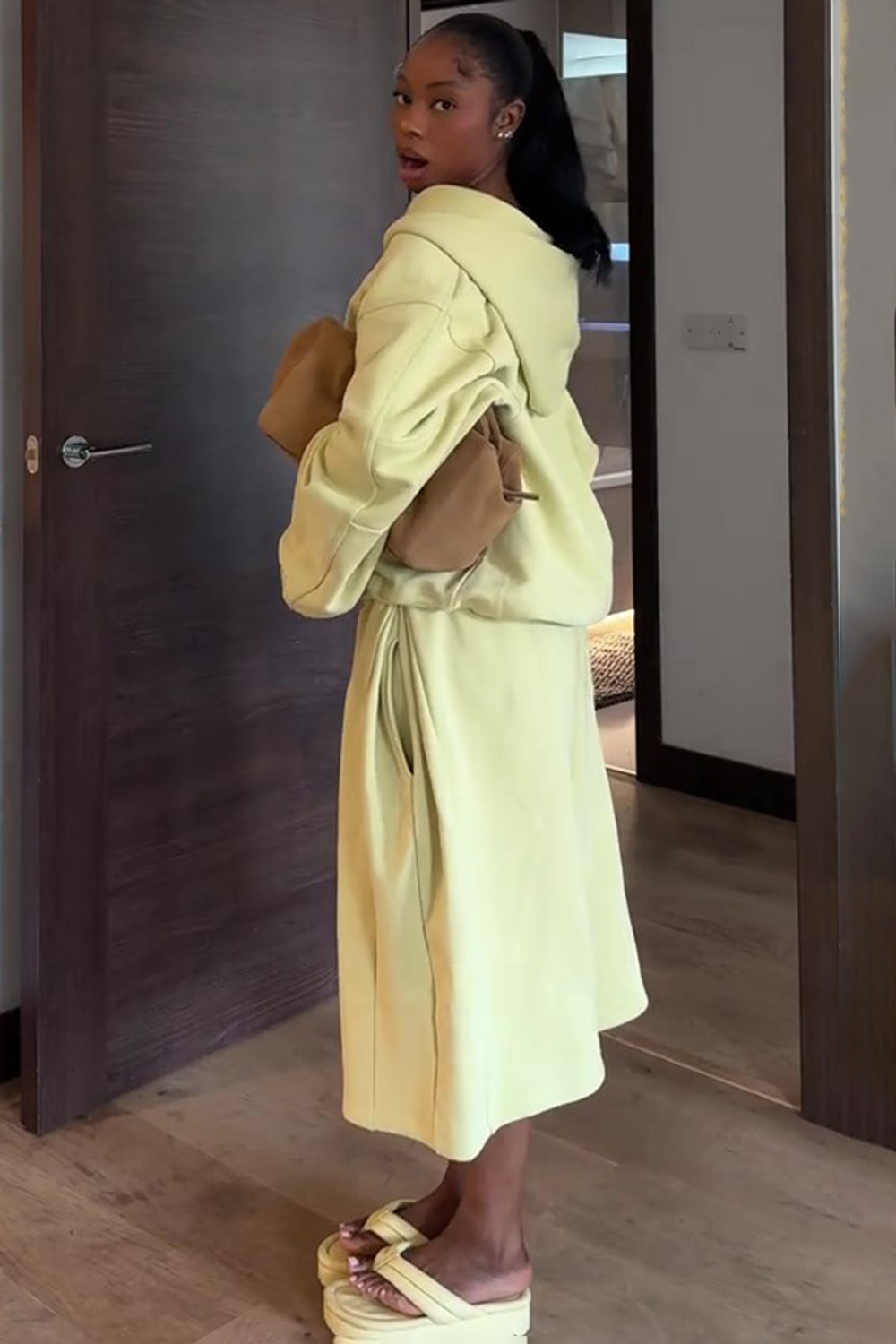 Zip-Up Hoodie Jacket Crop Wide Leg Pants Casual 2pcs Set-Yellow